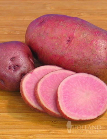 This hybrid potato is adored by both foodies and farmers. This low starch potato is high in anti-oxidants, and has both rosy red skin and flesh.
