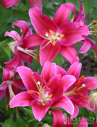 Deep pink red vibrant blooms adorn this fragrant Oriental Lily in Mid-Summer! Flowers face outward and are accented by a white edge around the petals.