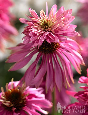 If you are looking for something truly unique to add to your Summer garden, look no further than the Double Decker Coneflower!  This unusual variety offers a double flowering bloom with rosy pink petals, a dark brown center and topped with a set of upward facing shorter petals!  Blooming mid to late Summer, the Double Decker Coneflower will often times rebloom until frost.  Remove spent flower stems to encourage additional blooms.  The Coneflower attracts hummingbirds and butterflies, is deer resistant and tolerates drought and heat once established.  You can expect to see some double blooms the first season with more appearing each year as it continues to mature.  Don’t hesitate to make the Double Decker Coneflower part of your garden today!