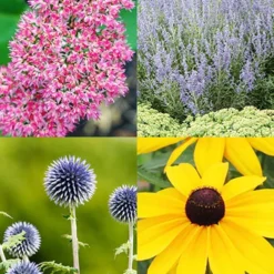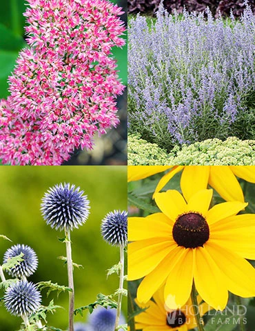 This collection of perennial garden plants thrives in dry soil. Whether the soil is naturally well draining and does not hold moisture, or the area does not get regular water these plants will grow well in these areas. Note, upon establishment these perennials will require regular watering. Once they are established in your garden they tolerate low water conditions quite well.
