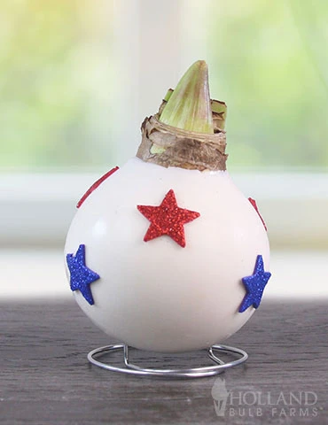Life, Liberty and Waxed Amaryllis! Our Liberty Waxed Amaryllis is a showstopper with its white waxed base and glittery blue and red stars! All of our Waxed Amaryllis are hand dipped in house making each one special! No water or soil necessary to watch these grow in your home! Just place it in a warm, bright location and watch the beautiful red bloom grow!