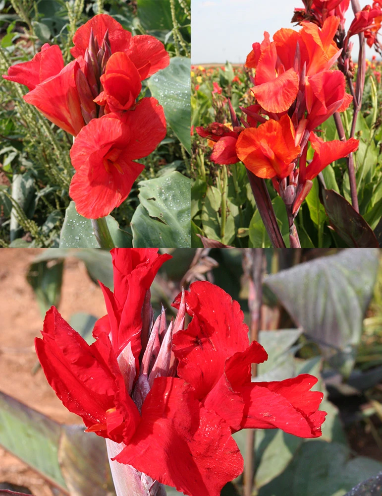 Red King Humbert Cannas have bronze leaves with red/orange blooms, reaching heights of 60″+.
