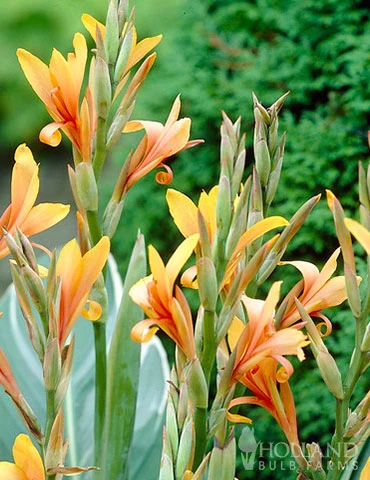 This canna features bold leaves that are striped with green and white. Orange flowers will appear in mid summer, but the best feature of this canna is definitely the variegated leaves. Best when grown in a partially shaded location, as full sun will most likely warrant sun burn on the leaves. Thrives in a moist location with protection from the afternoon sun.